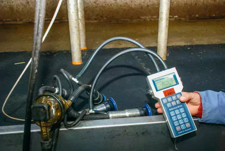 Au niveau de la chambre de réception, point central de la salle de traite, le contrôleur mesure la réserve réelle de l’installation et l’absence de fuites d’air dans l’installation. Avec un débimètre, il teste la quantité d’air admissible dans l’installation sans perturbation de la traite. De plus, au niveau de chaque griffe, l’étanchéité permet le respect du vide et l’entrée d’air, non bouchée, une bonne évacuation du lait.