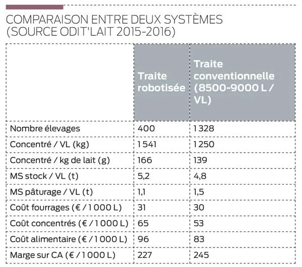 Sur les mois d’avril, mai et juin 2015, ce coût était de 66 €/1000 litres. Il est à peine plus élevé sur la même période de 2016 (69 €/1 000 L). La différence entre les « traites robotisées » et les « traites conventionnelles » se fait souvent à cette période. Les premiers continuent à donner de l’aliment (pour attirer les vaches au robot) quand les seconds limitent drastiquement les concentrés.