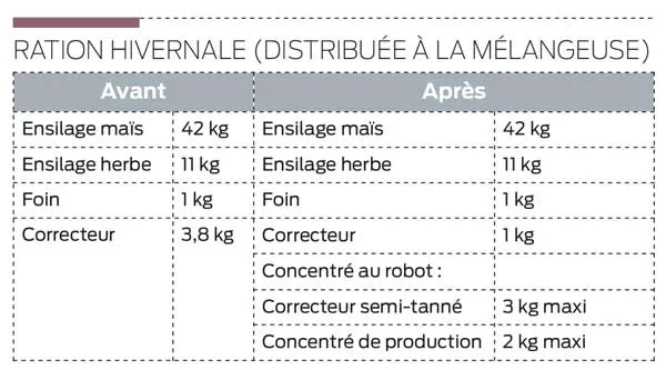 Mis à part la traite, la conduite du troupeau a peu évolué. L’affouragement en vert était déjà la règle auparavant. « Nous avons des terres peu portantes et avec l’agrandissement du troupeau, le pâturage devenait problématique ». De septembre à mi-décembre, et du 15 février au 15 avril, les dérobées de RGI, de colza ou de trèfle incarnat sont fauchées et apportées au cornadis. Après la mi-avril, les prairies de mélanges de RGH et de trèfles, violet et blanc, prennent le relais à la table d’alimentation. En moyenne, sur l’année, l’affouragement en vert représente 30 à 40 % de la ration. Les vaches profitent d’un parcours libre de 5 hectares à proximité de l’étable. Une surface supplémentaire de 7 hectares a été pâturée cet été. La ration hivernale a peu évolué. Elle est toujours à base d’ensilage de maïs et d’herbe. Le poids des concentrés a augmenté mais reste volontairement limité même pour les fortes productrices (voir tableau). « L’objectif, sur une