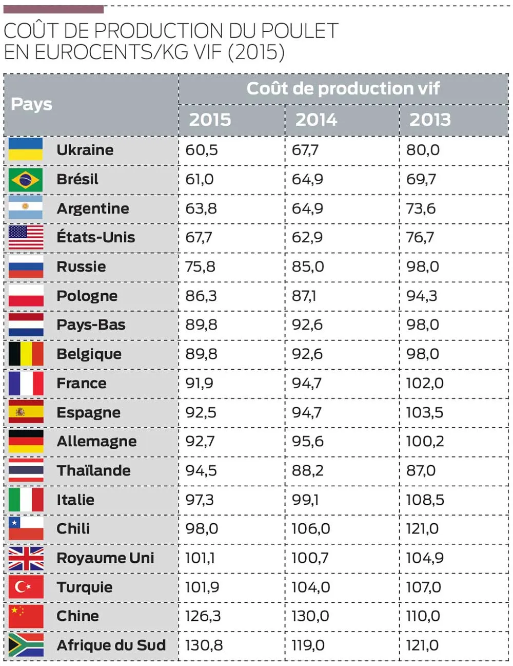 « Dans le classement général, le Brésil reste dominant malgré la poussée orientale. Les États-Unis et le Royaume-Uni pâtissent de l’appréciation de leurs monnaies. La Pologne est au premier rang des nations de l’UE, au niveau de la Thaïlande et de l’Argentine. La France améliore son score grâce à la baisse du coût des matières première et à la structuration de la filière », conclut Christian Renault. Il ajoute : « L’Europe de l’Est, de la Pologne à la Russie en passant par l’Ukraine et la Biélorussie, est un bassin d’avenir pour la volaille. La percée sur les marchés reste timide (sauf la Pologne) pour des raisons de protection, de délai de reconversion pour l’Ukraine et de demande intérieure ».