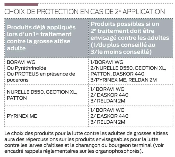 Si une deuxième protection est nécessaire, selon la première application, le tableau ci-contre indique les solutions possibles contre les adultes : du plus conseillé vers le moins conseillé dans un cadre de résistance des altises d’hiver. Si la solution Boravi WG est disponible, il faut l’utiliser préférentiellement, avec 2 applications possibles par campagne en respectant un intervalle de 7 jours, à une dose de 1 kg/ha, sans oublier d’y ajouter un acidifiant.