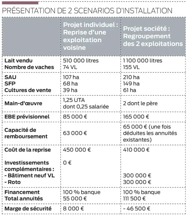 Le projet de reprise individuelle paraît plus cohérent. Mais comment aborder la reprise chez le père au terme des 5 ans ? L’achat initial ne sera pas encore amorti financièrement. Les investissements resteront nécessaires dans le cadre d’un regroupement. Et la masse de travail demeurera.