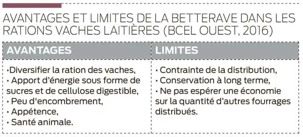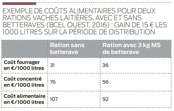 La betterave fourragère est un excellent fourrage de par ses valeurs nutritionnelles et présente un intérêt économique (en limitant les concentrés), des effets positifs sur la santé animale (difficilement chiffrables) et des gains sur les taux. Sa distribution permet une économie de 200 kg de concentré de production par VL sur la période de distribution de la betterave, de novembre à mars, soit 150 jours, ce qui représente entre 50 et 60 € d’économie par VL. Avec un apport de 2,5-3 kg MS de betterave, on peut espérer en plus un gain de 1 à 1,5 point de TP et 1 à 3 points de TB.