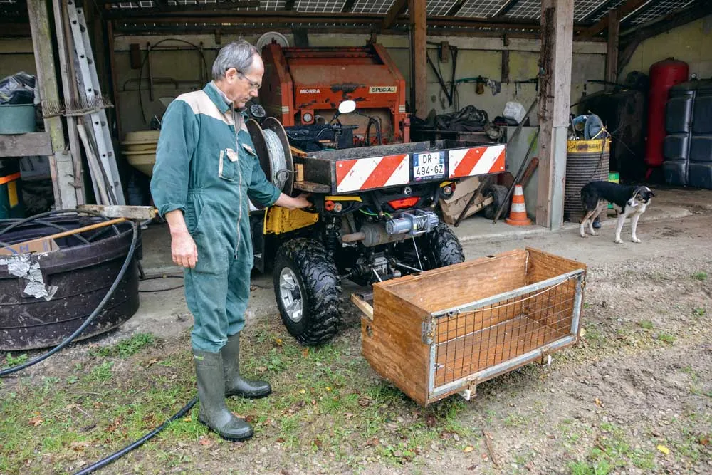 Le gros du travail pour le quad est étalé entre les mois de septembre et d’octobre, où les clôtures sont démontées pour l’entretien des parcelles. « Je mets un quart d’heure à déclôturer une parcelle de 1,5 ha ». Les ressorts des amortisseurs ont été changés pour supporter le poids supplémentaire embarqué. À l’arrière, la caisse en bois descend avec un astucieux système monté sur parallélogramme et actionné par un treuil. « Il arrive d’y charger un jeune veau. Dans ce cas, la porte grillagée est conçue pour que la vache puisse toujours voir son petit ».
