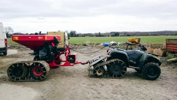 « L’objectif premier est de pouvoir intervenir dès que possible réglementairement dans les parcelles, sans abîmer la terre ni marquer les céréales, avec un concept assez léger. Le tout pèse 1,2 t », explique l’utilisateur. Le quad de 350 kg tracte un chariot, support du semoir à engrais Vicon, équipé d’un moteur auxiliaire qui actionne la prise de force et permet d’épandre le premier, voire le deuxième apport de minéral si le sol est toujours mouillé. Mais lors des premiers essais, le quad Arctic cat 700 s’enlise. Il a donc fallu l’équiper pour une meilleure portance.
