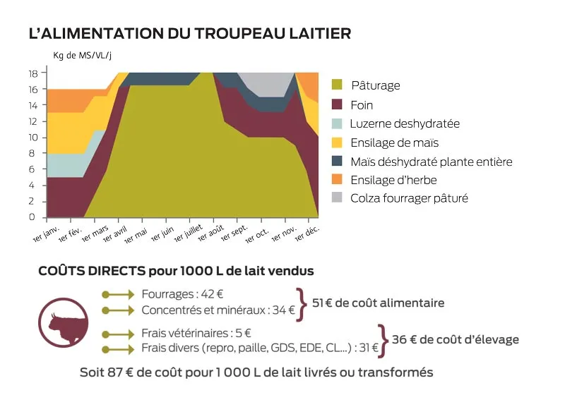 L’objectif est de faire vieillir les 57 ha de prairies au maximum (10 ans) pour limiter les coûts d’implantation et l’impact écologique de la ferme. Les prairies sont multi-espèces pour obtenir une pousse régulière de l’herbe quelles que soient les conditions météorologiques et assurer une diversité de la ration offerte aux animaux : RGA, fléole, pâturin des prés, 2 variétés de trèfles blancs, plantain.
