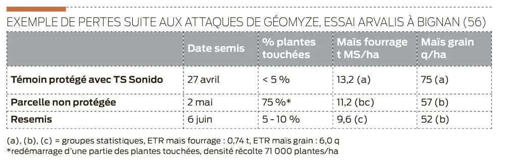 Dans les parcelles non protégées, les pertes de rendement sont estimées entre 10 et 50 %. L’impact est plus fort en production de grain qu’en maïs fourrage (voir tableau, essai réalisé à Bignan).