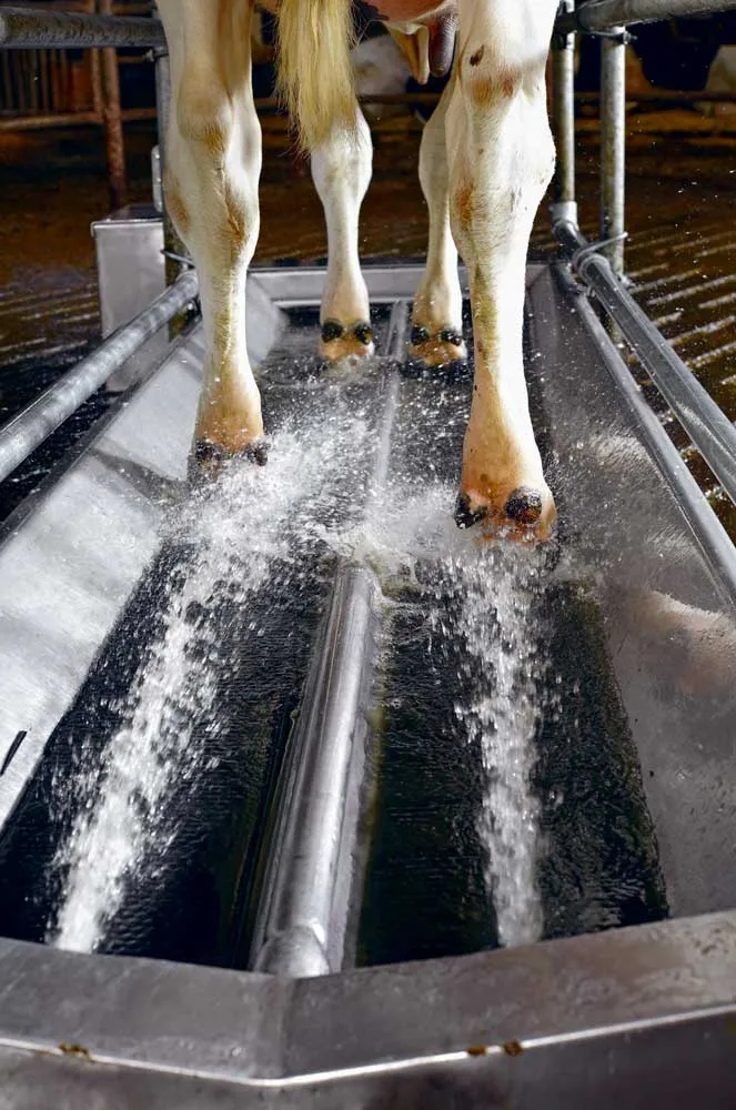 Installé en sortie de robot de traite, le pédiluve est équipé d’une cellule qui détecte le passage de chaque vache. À ce moment-là, une électrovanne déclenche un double circuit d’eau orienté vers les pattes pour enlever les bouses. « Une cuve me permet d’ajouter un produit désinfectant.», explique l’éleveur, « il est conseillé d’ajouter un désinfectant 2 jours tous les 15 jours » précise le technicien. Robuste, le pédiluve est constitué de deux fosses parallèles en acier inoxydable.