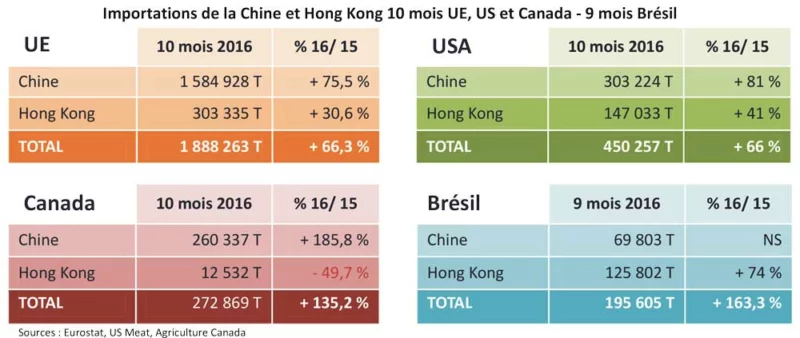 Sur les 9 mois cumulés, la production européenne serait en hausse de 1,5 % selon la commission européenne soit environ 260 000 tonnes supplémentaires de production. Sur la même période, les exportations pays tiers ont progressé de 707 600 T. La demande pays tiers a soustrait près de 450 000 T à la consommation européenne ! Un véritable ballon d’oxygène pour le prix du porc européen !! Les graphiques et tableaux ci‐ après mettent en perspective l’impact du commerce pays tiers 2016 et le rôle primordial de la Chine. Ils permettent également de hiérarchiser les quantités entre exportateurs UE, US et Canada.
