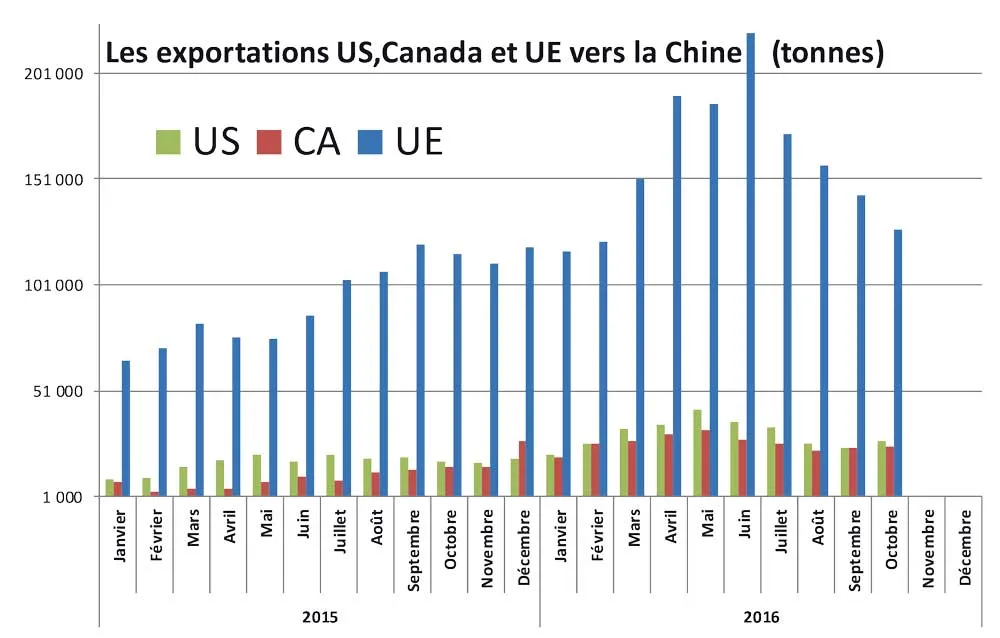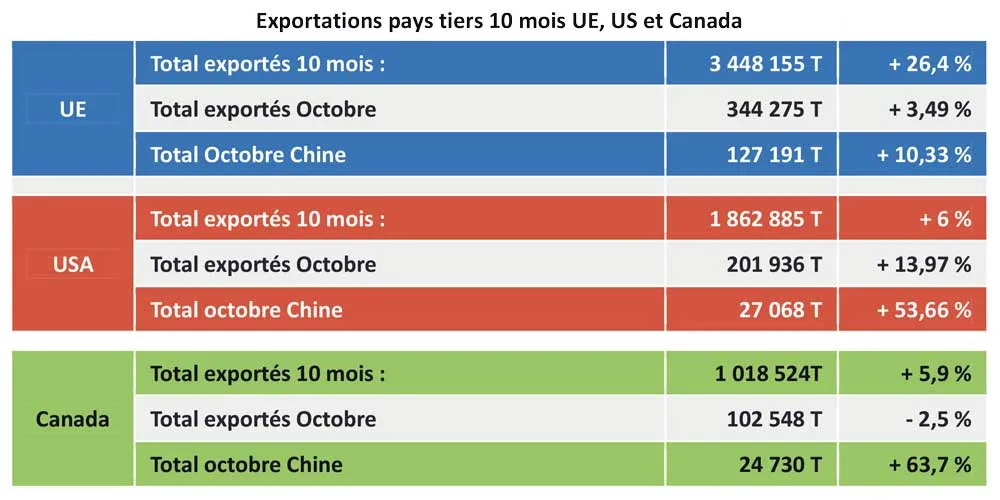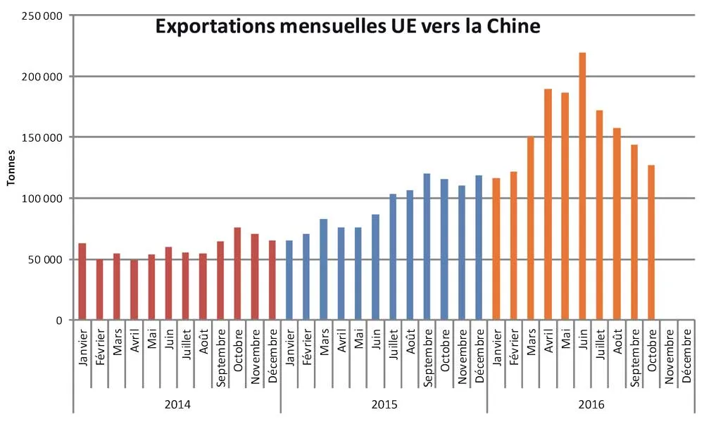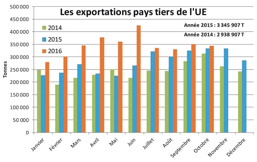 La communauté européenne vient de publier les statistiques cumulées 10 mois 2016 des exportations pays tiers. Les exportations d’octobre progressent de 3,49 %. Sur 10 mois, la croissance est de 26,4 % à 3 448 155 T. Ce volume (10 mois) est déjà supérieur au meilleur total annuel jamais réalisé.