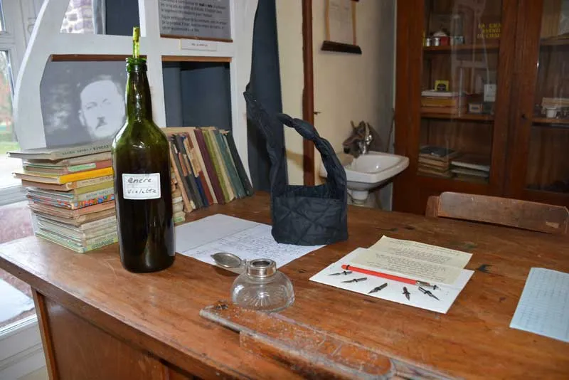 Une odeur forte de cire les accueille dans leur salle de classe. Ils se dirigent calmement vers leurs pupitres en bois foncé, régulièrement astiqués, alignés face au tableau noir et au bureau du maître installé sur l’estrade. En haut de leur plan de travail légèrement incliné, une rainure leur permet de poser crayons et porte-plumes. Sur le bureau du maître, trône la bouteille en verre au bec verseur en métal dans laquelle le maître a préparé l’encre. L’élève de corvée doit déverser le fameux liquide violet qui tâche les doigts, dans chaque encrier en porcelaine blanche. L’enfant y trempe sa plume pour retranscrire sur son cahier immaculé la date et la morale du jour écrite au tableau par le maître, de sa belle écriture nuancée avec les pleins et déliés.