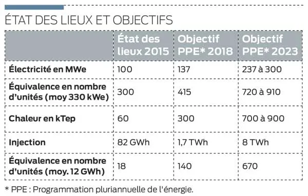 Plusieurs textes réglementaires fixent des objectifs pour les années à venir. Pour ce qui est des objectifs de développement des énergies renouvelables, l’arrêté du 24 avril 2016 décrit les objectifs de développement de la méthanisation à l’horizon 2018 et 2023 (voir tableau). Il conforte le chiffre de développement de 1 000 méthaniseurs à l’horizon 2020 prévu par le Plan Énergie méthanisation autonomie azote (Plan EMAA, 2013). Pour y répondre, d’après l’Adème, le gisement mobilisable à l’horizon 2030 est principalement agricole.