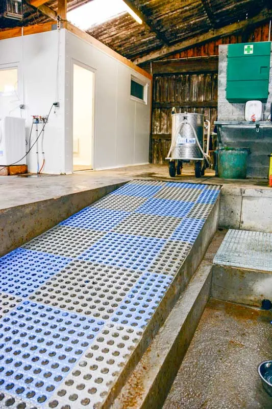 Pour le confort des intervenants, plusieurs astuces ont été bien pensées. « Plutôt que des marches pour accéder dans la fosse, notre client a préféré une rampe. Le béton de la salle de traite est aussi légèrement courbé, pour assurer une bonne posture de l’intervenant ». Toujours dans ce souci d’ergonomie, les plateaux qui recueillent les griffes rentrent littéralement dans le quai, libérant ainsi de l’espace. « La machine à traire est le seul outil de l’exploitation à avoir près de 1 000 heures de fonctionnement par an. La bonne hauteur du quai de traite évite les douleurs dans les épaules. Enfin, la sortie rapide des vaches nous fait gagner un temps fou par rapport à l’ancien système », confie Anne-Thérèse Le Ru.