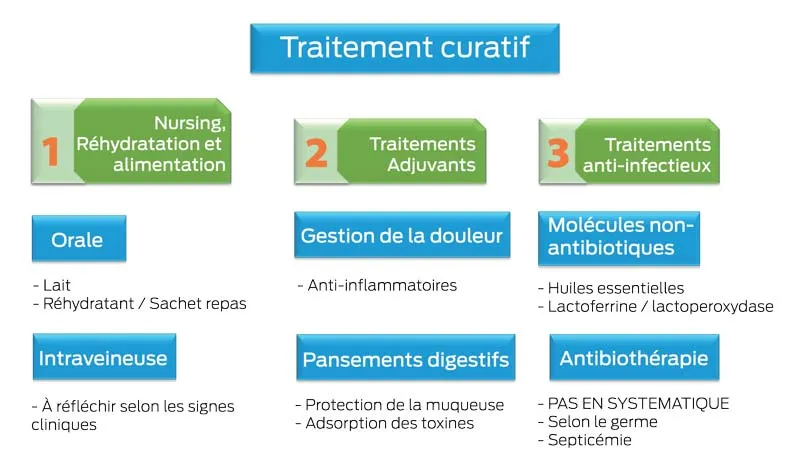 Enfin, la vétérinaire rappelle que la douleur de l’entérite doit être gérée par utilisation d’anti-inflammatoires. « En dernier lieu, viennent les traitements anti-infectieux qui ne sont pas forcément des traitements antibiotiques puisque des associations de molécules naturellement retrouvées dans le lait (lactoferrine et lactoperoxydase) donnent déjà de bons résultats, de même que certaines huiles essentielles (origan) et levures (effet barrière, réensemencement). L’utilisation des antibiotiques ne doit pas être systématique et doit surtout être justifiée. »
