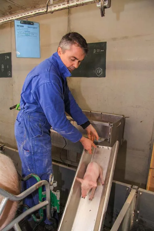 Le toboggan en aluminium est aussi un atout pour le bien-être des porcelets car il a été conçu pour une dépose au sol en toute sécurité. L’éleveur place le porcelet en haut du toboggan qui glisse jusqu’au sol avec des appuis stables : l’outil limite les douleurs aux pattes lors de la réception au sol. De plus, lors du lâcher, l’éleveur n’a plus besoin de se pencher, ce qui réduit les contraintes physiques liées à la répétition de ce geste. « Le chariot Telip montre aux élèves que les tâches en porcherie peuvent être moins pénibles : c’est ce genre d’outil qui attire les jeunes dans l’élevage, » confie David Desbois.