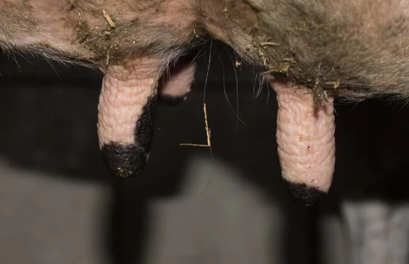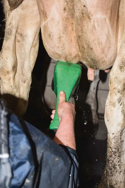 L’équipement Pulisistem F60 est assez simple et rappelle la technologie de nettoyage utilisée sur certains concepts de robot de traite : « Nous opérons trayon après trayon. Au premier passage, nous appuyons sur une gâchette qui commande la distribution d’une solution tiède contenant un produit lavant et désinfectant. Combinée à l’action des trois brosses (deux latérales pour nettoyer le corps du trayon jusqu’à sa base, la troisième inférieure pour prendre soin du sphincter), la peau est propre en quelques secondes. » Un second passage est effectué, sans produit cette fois, pour sécher les trayons.