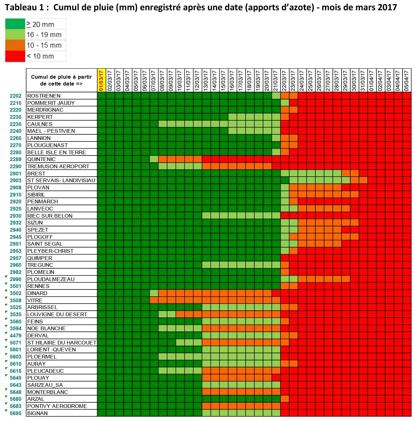 L’absence de pluie depuis le 25 mars sur l’ensemble de la région conduit à des situations de stress azotés, en particulier pour les parcelles les plus séchantes. Les pluies annoncées dans les prochains jours devraient permettre une valorisation des apports postérieurs au 25 mars. Il faut donc profiter de ces pluies annoncées pour effectuer le dernier apport d’azote qui sera ainsi mieux valorisé.