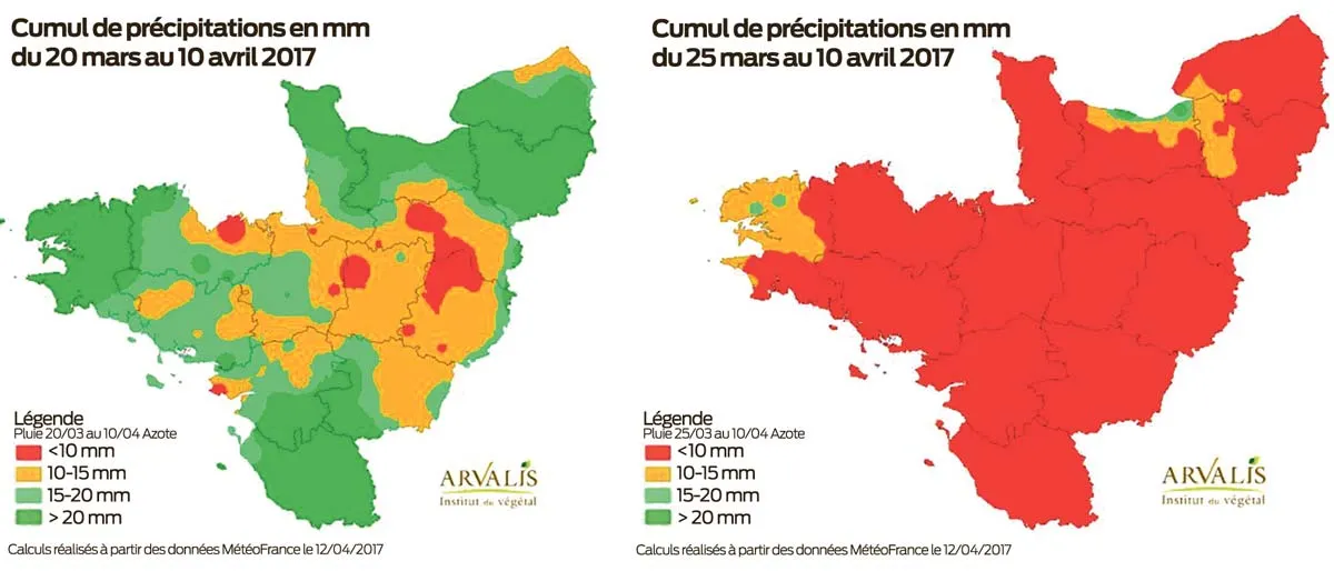 Sur l’ensemble de la région Bretagne, les cumuls de précipitations ont été faibles depuis la fin mars, avec une incidence sur l’assimilabilité de l’azote.