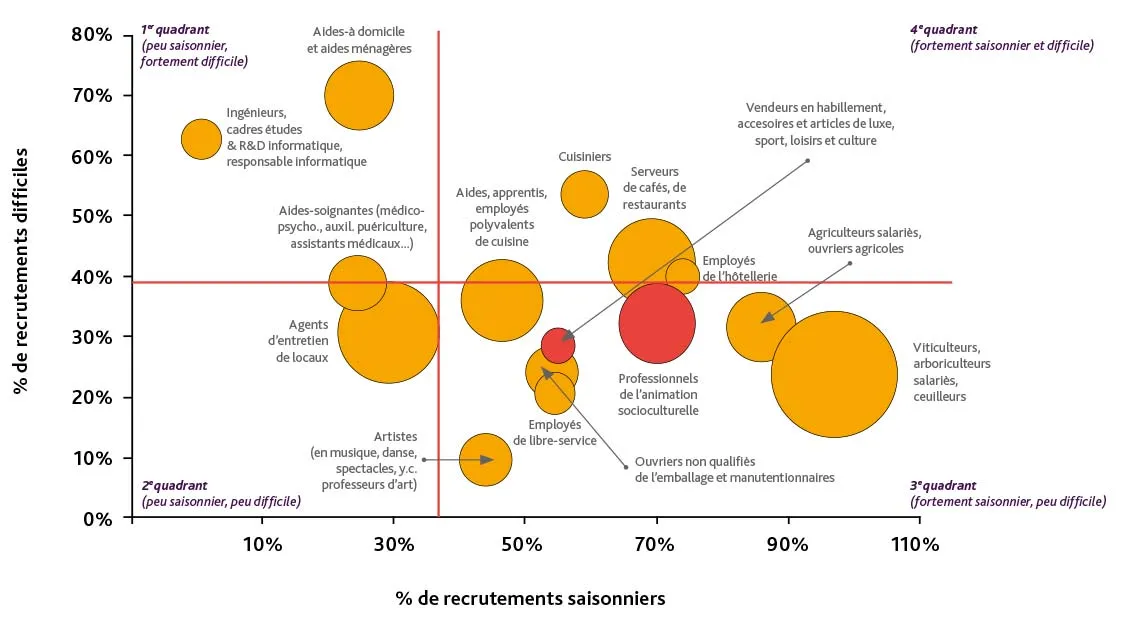 La grande majorité des recrutements prévus sont saisonniers (90 %), mais les projets de recrutements non saisonniers progressent en un an de plus de 10 %. La moitié est concentrée dans la viticulture et l’arboriculture, un quart s’adressant à des emplois saisonniers d’agriculteurs et ouvriers agricoles. De manière générale, bien qu’importants en quantité, les projets de recrutements sont jugés peu difficiles par rapport à la moyenne générale, à l’exception des emplois forestiers, des conducteurs d’engins et des pêcheurs. Les mauvaises conditions de travail sont les principaux freins à l’embauche avancés par les employeurs.
