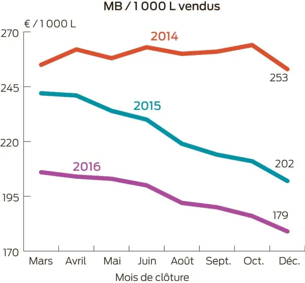 Le prix du lait se dégrade tout au long de l’année 2016 avec un point bas en décembre à 292 €/1 000 L. Chaque mois, la rentabilité des producteurs laitiers s’amoindrit dans les comptabilités, ceci malgré la réduction des charges. Le coût alimentaire se replie de 6 €/1 000 L suite à la baisse du coût de concentrés (diminution des quantités distribuées). Cependant, il tend à remonter depuis quelques mois suite à une campagne fourragère moins favorable. Pénalisée aussi par la conjoncture viande dégradée et par le faible niveau des cours des veaux, la marge brute de l’atelier lait dégringole à près de 180 €/1 000 L (voir graphique).