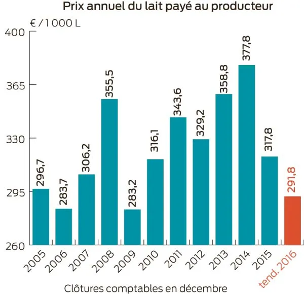 Au repli des charges opérationnelles s’ajoute une baisse de plusieurs postes des charges de structure. D’abord les charges sociales affichent un repli (baisse des taux ; options N-1). Les dépenses de carburants, d’entretien et d’amendements sont aussi réduites. L’effet dilution s’estompe car les volumes livrés ont tendance à se stabiliser. Les producteurs réduisent aussi leurs prélèvements privés. Au final, la réduction des coûts est appréciable en 2016 mais elle ne permet pas de résister à une crise de prix du lait liée à un déséquilibre offre/demande.
