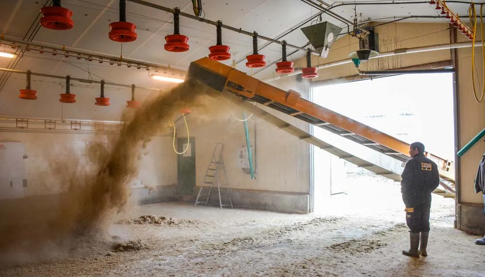 « Nous avons remplacé les copeaux par cette paille broyée finement. Les copeaux sont assez coûteux pour un résultat qui n’est pas toujours parfait. Dans ce bâtiment spécialisé en poulet sexé et sur terre battue nous allons mettre 4,5 kg/m2 avant l’arrivée des poussins. Après calcul, nous arrivons à un coût de litière après broyage de 120 €/tonne », indique Alix Gallouédec associé du Gaec. Les éleveurs qui utilisent depuis plusieurs lots cette paille broyée finement constatent une nette amélioration des taux de pododermatites. « J’étais à 100 % de taux de pododermatites sur tous mes lots et j’ai réussi à tomber à 31 % sur mon dernier lot avec cette litière », lance un aviculteur.