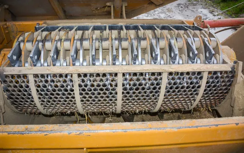 L’entrepreneur a ensuite testé pendant 1 an le passage de la paille dans un broyeur à grain en bout de poulailler, un système qui s’est avéré assez concluant. « Nous avons donc décidé de nous mettre en quête d’une machine spécifique pour réaliser ce travail. Nous avons trouvé un broyeur aux États-Unis de marque Duratech qui pouvait convenir et qui est utilisé pour broyer et défibrer du foin avant incorporation dans la mélangeuse. » C’est un gros broyeur à marteaux avec différentes grilles de calibrage interchangeables qui déterminent la finesse de hachage de la paille. L’entrepreneur a envoyé des échantillons de paille avec différentes finesses de hachage afin qu’ils fournissent des grilles adaptées avec la machine.