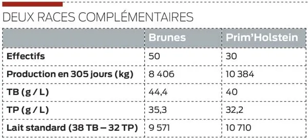 « Notre objectif est de mettre en avant la mixité des races brune et Prim’Holstein qui vont très bien ensemble », démarrent Aurélie et Antoine Cogneras, éleveur à Langourla (22). « La Prim’Holstein est tout de suite productive. La Brune, un peu moins précoce, apporte de la matière utile dont on voit l’intérêt aujourd’hui. À l’échelle du troupeau, chaque mois, les taux rapportent une plus-value d’au moins 2 000 € », calculent-t-ils. Dans les bilans génétiques, le Gaec de la Saudraie à se distingue en note globale : au 1er rang en race Brune avec 86,6 points contre 85,2 en Prim’Holstein.