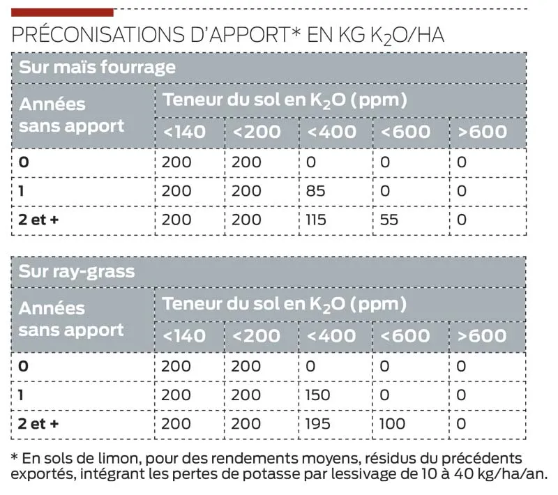 Mais ce type d’apport peut être insuffisant s’il n’est apporté que sur maïs dans une rotation fourragère productive. Une analyse de terre régulière est le meilleur outil pour raisonner ses apports. L’impasse de fertilisation pour une année n’est possible qu’au-delà d’une teneur de 200 ppm et si un apport a été réalisé l’année précédente. La dose maximale conseillée est de 200 unités/ha, aucune réponse de rendement n’ayant été observée au-delà sur les cultures fourragères, même en situation carencée.
