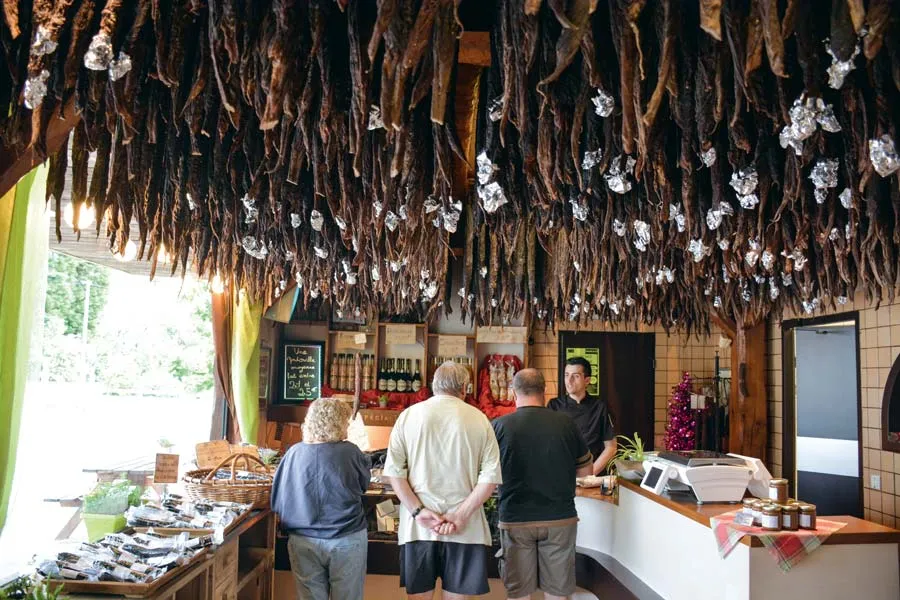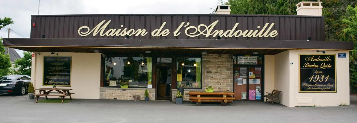 La charcuterie créée en 1931 s’est spécialisée dans l’andouille en 1996 lorsque Benoît Rivalan et sa femme Françoise Quidu deviennent la 4e génération à reprendre l’affaire familiale. « Nous avons ici une ambiance qu’on ne peut pas reproduire en charcuterie. Les clients viennent pour le plaisir et pas pour se nourrir. » Lorsque l’on se gare sur la petite place devant la boutique et que l’on sort de sa voiture on ne s’y trompe pas : la bonne odeur de fumée attire inexorablement à l’intérieur du magasin. La première question que les gens posent en arrivant à la Maison de l’andouille c’est : « comment vous faites pour obtenir une andouille qui fait des ronds ? » La réponse de Benoît est simple : « On a une base que l’on appelle le cœur, que je compare à un pied. Nous allons ensuite enfiler 20 chaudins (gros intestin de porc), comme des chaussettes, les uns après les autres du plus petit au plus grand. Et voilà nous obtenons notre andouille. » Une vidéo diffusée dans la boutique illustre les propos du gérant.