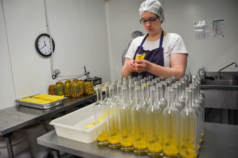 Enfin, les fruits frais sont découpés, puis insérés dans les bouteilles. « Tout tient dans l’équilibre des ingrédients. Le sucre flatte le goût, mais écœure. La macération doit au moins durer 2 mois. Pour la pomme, cette durée est allongée entre 4 et 5 mois. La banane contient beaucoup de sucre et donne ses arômes plus lentement. L’ananas est plus acide ». Le goût des rhums arrangés évoluera très vite dans le temps, avant de se stabiliser. Petit à petit, le fruit va absorber un peu d’alcool, le breuvage paraîtra moins fort.