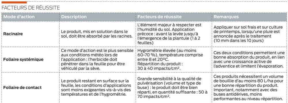 En ce qui concerne les conditions météorologiques, tout dépend du mode d’absorption du produit (voir tableau). On recherche en général des conditions poussantes, favorables à l’absorption de l’herbicide par les adventices. Il convient aussi de choisir le meilleur moment d’intervention dans un souci de sélectivité par rapport à la culture en place. La culture n’est pas la cible de l’herbicide mais elle en absorbe également et devra donc le détoxifier. Pour cela, il faut que les conditions météo des jours qui suivent le traitement soient aussi favorables que ceux au moment de l’application.