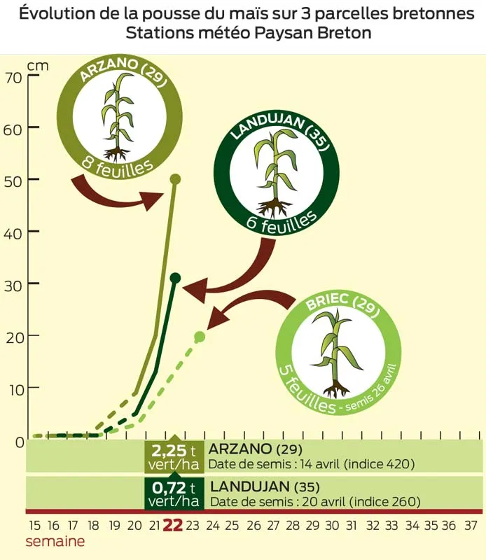 Le maïs a bénéficié des conditions climatiques très favorables de la semaine de l’Ascension avec de fortes chaleurs et de l’humidité dans le sol. Les racines ont accès à l’engrais starter s’il a été apporté au semis. Sur certaines zones géographiques, et tout particulièrement dans l’est des Côtes d’Armor et sur l’Ille-et-Vilaine, de violents orages dans la nuit de dimanche 28 au lundi 29 mai se sont abattus sur des sols ressuyés et tassés qui ont limité le ruissellement. L’eau a été absorbée assez rapidement. Reste à voir comment le sol va sécher suite à cet événement orageux, formant ou pas une croûte de battance.