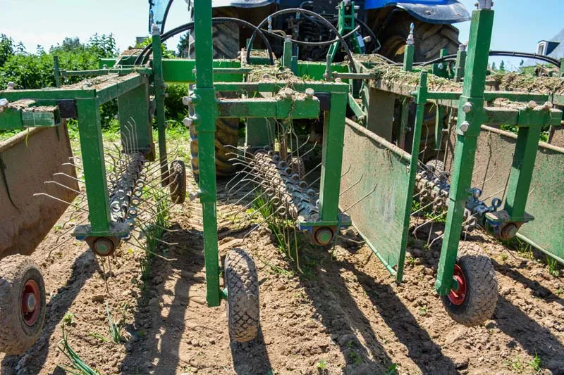 Sur une culture d’oignons, le producteur passe environ 3 fois la herse étrille puis une fois la bineuse à dents ensuite un passage avec la bineuse rotative à peignes et enfin 2 à 3 fois la bineuse à dents suivant les conditions météo. « Après un passage avec la bineuse à peignes, je repasse avec la bineuse à dents pour éliminer les adventices. En bio si on veut être crédible, il faut que nos cultures soient propres. » La mécanisation du désherbage permet d’intervenir dès qu’une fenêtre météo le permet même si c’est le soir ou le week-end. Le recours à du personnel n’offre pas cette souplesse.