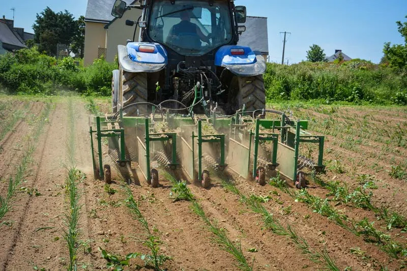 Peu répandue dans les campagnes bretonnes, la bineuse rotative à peignes est utilisée au Gaec Kerial à Penvénan (22) sur oignon, poireau et artichaut. Ce matériel spécifique permet de gagner du temps lors du désherbage et d’économiser de la main-d’œuvre.