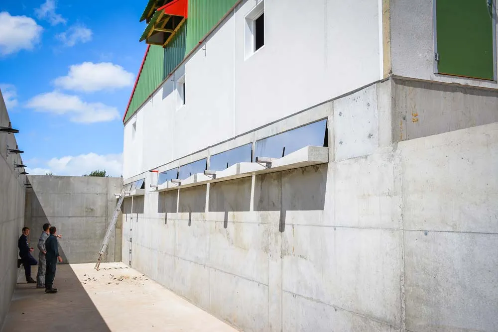 Selon les techniciens, les résultats de terrain montrent une augmentation de 10 à 15 % des performances zootechniques grâce à l’amélioration de l’ambiance (par rapport aux engraissements classiques) ». Le bâtiment fait 31 mètres de longueur sur 18 mètres de largeur. Les jus sont récupérés dans la fosse, à une des deux extrémités de l’engraissement, grâce à une pente de 1,5 % sur toute la longueur. Le racleur en V (Trac) achemine la partie solide dans une fumière située en façade du bâtiment, du côté opposé de l’évacuation des urines.