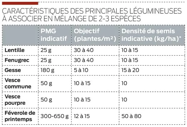 Les espèces et les variétés sont à choisir en fonction des objectifs, du milieu, du matériel de semis et des disponibilités. Si les petites graines peuvent être mélangées au colza, la féverole par exemple nécessitera une deuxième trémie ou un second passage.
