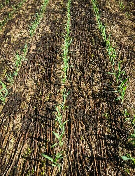 « Chez moi, le semis de céréales d’automne sous couvert vivant est déjà validé. Au tour des maïs déjà testé sur quelques hectares en 2016… » C’est impressionnant d’observer ce semis réalisé dans une telle biomasse. À l’avant du tracteur, un rouleau couche la végétation. À l’arrière, le semoir dépose les graines en terre sous ce mulch d’avoine et de féverole, ainsi que de l’urée 46 à 5 cm du rang (à la dose de 100 kg/ha) et un stimulant racinaire en semoulette (TMS chez TMCE). Autre détail, la semence a été préalablement enrobée par un stimulateur de germination liquide (TMF).