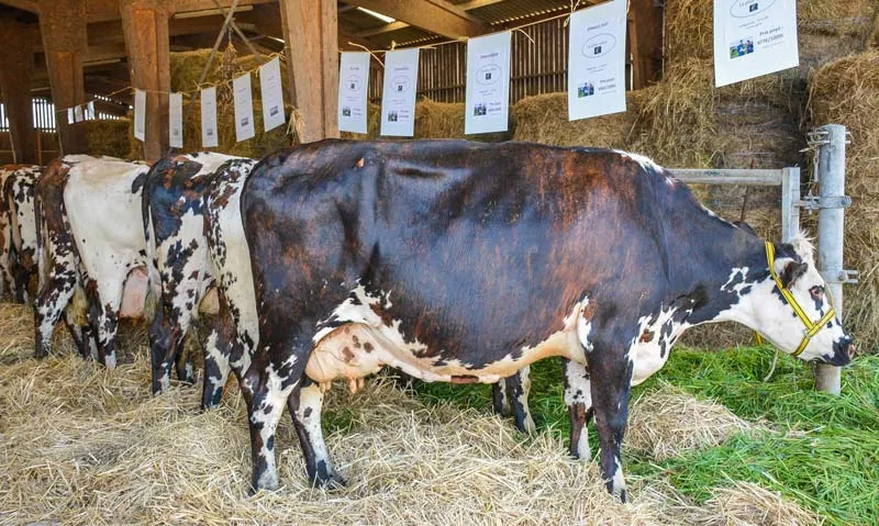 Un affouragement en vert est réalisé très tôt dans la saison, lorsque le pâturage est encore difficile et en période estivale, sur des parcelles plus éloignées, réservées à la fauche, pour éviter d’enrubanner. Les colzas fourragers, implantés entre deux prairies, sont également apportés à l’auge (auto-chargeuse). L’objectif de production est de 6 000 litres par vache et par an. Les génisses ont du lait entier jusqu’à 3 mois, puis du foin, du maïs grain (2/3) et un correcteur (1/3) jusqu’à 6 mois. Elles vêlent vers 27 – 28 mois.