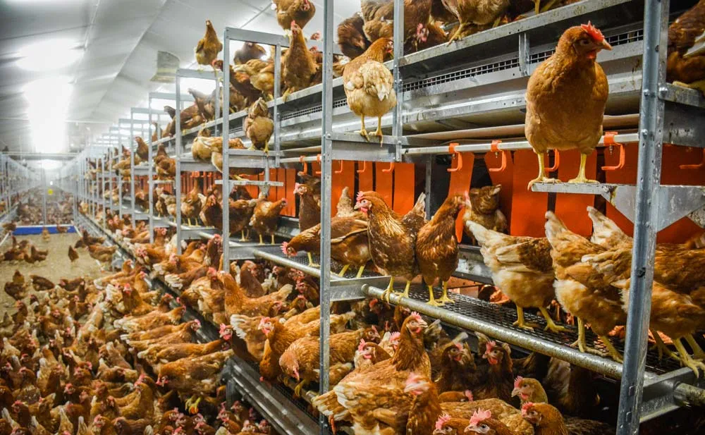 Les pondeuses occupent très bien chaque espace de la volière. - Illustration Une volière pour 40000 pondeuses plein air