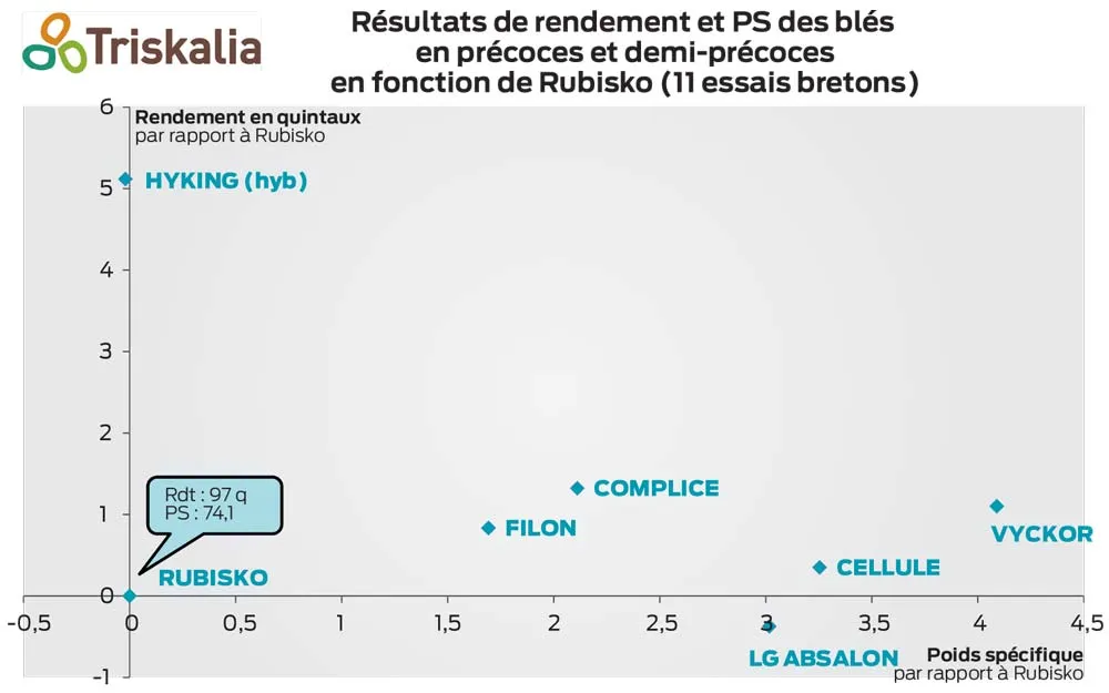 Elicsir, comme en 2016, est la 1re variété en rendement, avec un très bon PS. En plus de ces résultats, son bon profil maladies en fait une variété incontournable. Sur un créneau un peu plus précoce, RGT Oméac, nouveauté 2017, apporte un gain de PS de presque 6 points par rapport à RGT Eleac, tout en maintenant son potentiel.
