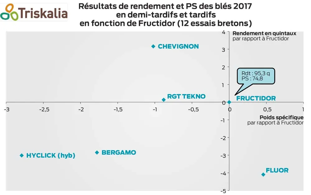 Chevignon, meilleure inscription 2016, confirme son haut potentiel dans tous les essais. À positionner sur le créneau des premières dates de semis, comme un Bergamo, cette variété apporte un gain de rendement et de la qualité. RGT Tekno et Fructidor, en blés de qualité, restent des références en demi-tardif (précocité 6) pour leur rendement. En PS, Fructidor garde un avantage, tandis que côté protéine, RGT Tekno est mieux. Fluor, une variété bien connue des éleveurs, est en retrait en rendement, mais demeure une référence en PS sur ce créneau de précocité.