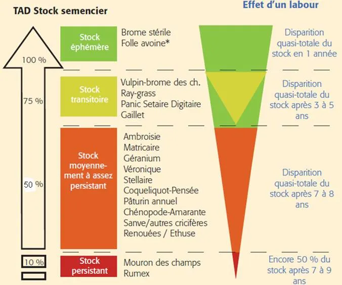 La majorité des adventices germe dans les deux premiers centimètres du sol. Une fois enfouies en profondeur par un labour, certaines graines de graminées ont une durée de vie courte et perdent leur pouvoir germinatif au bout d’un, deux ou trois ans.