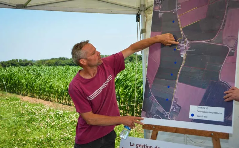 Les chemins empierrés autour de l’exploitation desservent des paddocks gérés finement. « L’eau et l’électricité sont accessibles à chaque paddock, de 1 à 1,5 ha, pour 1,5 à 2 jours de pâturage, au maximum 3 jours. L’herbe mesure en entrée 10 à 15 cm, l’objectif de sortie est de 5 à 6 cm. Le fil avant est déplacé tous les jours ». Pour la saison prochaine, l’éleveur a déjà prévu la future herbe pâturable, en semant un ray-grass d’Italie sous maïs. Il sera disponible dès janvier/février.