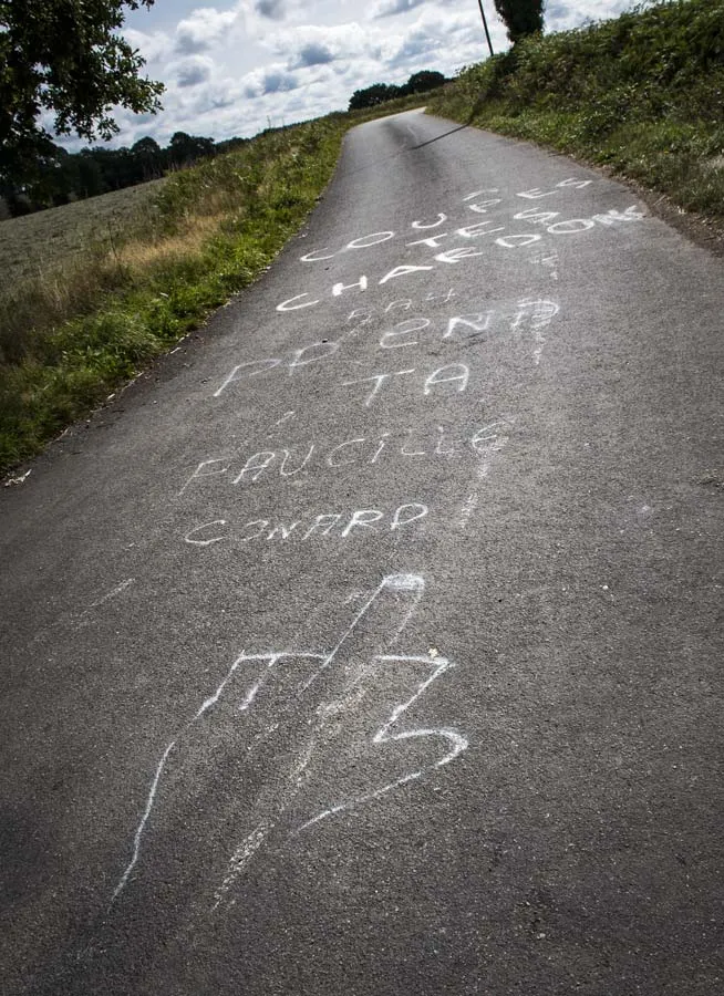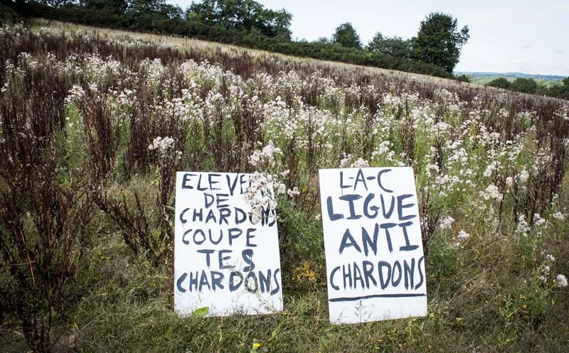 Cette grogne dissimulée s’exprime désormais au grand jour. Depuis fin juillet, la Lac multiplie les opérations. Cela a débuté et se poursuit par l’écriture de dizaines de messages à la peinture blanche sur la chaussée ou le placardage d’écriteaux, ça et là, aux entrées de champs ou sur des bottes de paille, pour signaler les chardons en végétation. « Éleveur de chardons, coupe tes chardons », « Chardons halte », « Le village des chardons », « Semenciers », « Herboriste de chardons »…