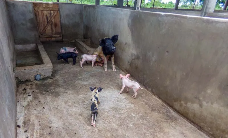 Sur la plus grande exploitation du diocèse, à Monsourou, 107 ha sont exploités sur les 500 ha. La superficie totale est peu accessible car les voies d’accès sont dégradées. Des ateliers de porc, de vache allaitante et de volaille ont vu le jour et sont gérés par une dizaine d’employés. Grâce à son séjour breton, il y voit des pistes d’amélioration pour contrer les éléments qui brident la productivité et l’efficacité du travail. Dans l’atelier de 50 truies de races locales métissées, on compte 7 porcelets par truie en moyenne, avec 2,5 portées par an. Il n’y a pas d’insémination artificielle. De plus, le bâtiment n’est pas structuré, les mères restant dans la même case. L’élevage des 500 poules pondeuses sur copeaux rend le ramassage difficile, laborieux et coûteux en main-d’œuvre en absence de pondoirs.