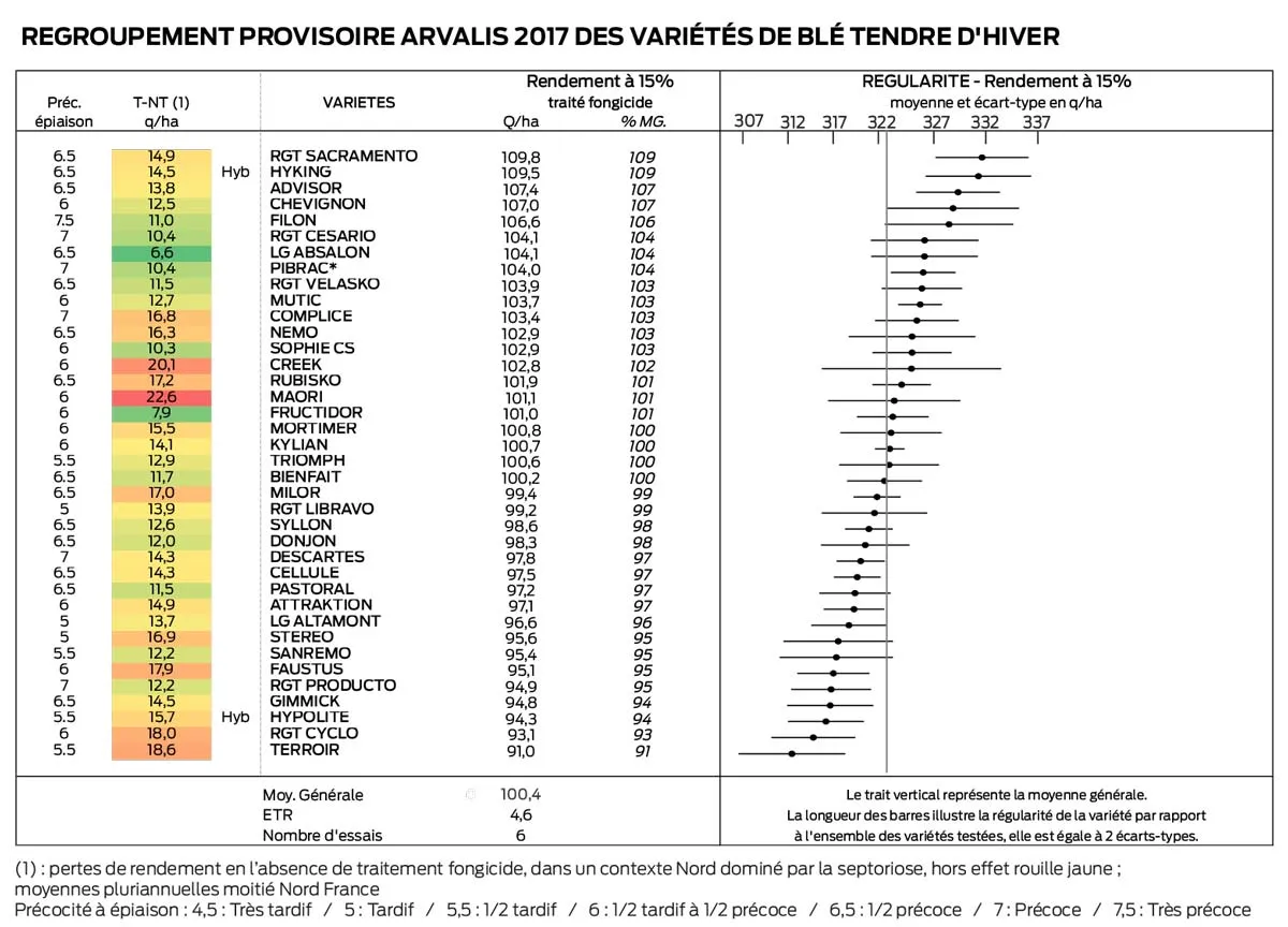 Comme chaque année, de nouvelles inscriptions apportent du potentiel, mais aussi de la tolérance aux maladies. Trois nouveautés se classent ainsi dans le top 5 du regroupement 2017. Les résultats des 6 essais de variétés de blé mis en place en Bretagne et Basse Normandie confirment cette tendance. Nous remercions les partenaires bretons (coopératives Garun-Paysanne, Le Gouessant et Triskalia) qui se sont associés à Arvalis pour mettre en place et assurer le suivi des essais.