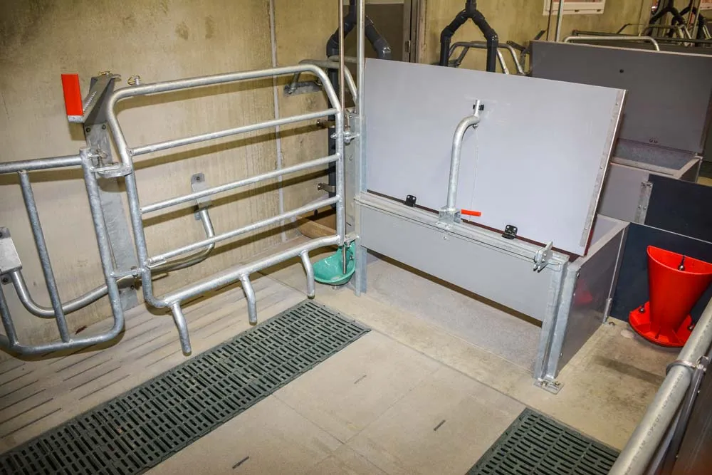 La verraterie gestante peut être brumisée pour abaisser la température en période estivale ou chauffée ( 21 °C demandés) via des aérothermes en période hivernale. La gestante est conduite en lots de 6 à 8 truies, avec bat-flanc en béton. L’aliment est distribué en soupe. Les salles de post-sevrage comptent 300 places, réparties en 8 cases. Les porcelets sont sexés et calibrés en fonction du poids à l’entrée (pesées à l’entrée et à la sortie du PS). Ils reçoivent plusieurs petits repas (sondes en fond d’auges). Des panneaux chauffants relevables ont été installés en fond de cases, sur toute la largeur, pour assurer un confort maximal.