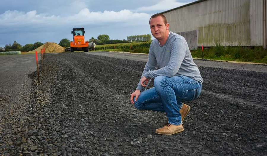 « Une première taupinière de 48 m x 25 recevra le maïs pour les rations hivernales. Un second silo, plus petit de 25 m x 26 sera utilisé pour nourrir les animaux l’été, avec une faible hauteur pour un front d’attaque qui avance rapidement », explique Daniel Guillerm, un des associés du Gaec de Keroulidic, ferme laitière où se situent les travaux, à Guisseny (29). Une bonne préparation est nécessaire avant l’application de la couche d’enrobé. « Une quinzaine de centimètres de cailloux (du 0/30) sont étalés et compactés. Ils proviennent de carrière ou peuvent être recyclés sur place, à l’aide d’un concasseur qui a la capacité de broyer une ancienne dalle béton », explique Mathieu Léal. L’enrobage intervient ensuite, avec un matériau aux propriétés particulières. « Sa densité est de 150 à 160 kg/m2, pour une granulométrie de 0/10. Un liant est incorporé pour éviter les attaques acides de l’ensilage ». Des pentes sont respectées, d’1,5 % au minimum, pour l’évacuation des eaux.