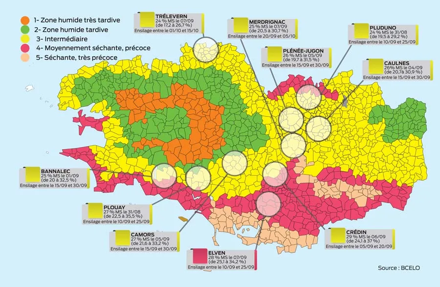 En zone très précoce (cf. carte), les ensilages, démarrés fin août, ont bien avancé. Les chantiers battent leur plein cette semaine en zone moyennement séchante, dans le Sud-Morbihan où les teneurs en matière sèche mesurées par BCEL Ouest s’échelonnaient de 25 à 34 % jeudi 7 septembre à Elven (56), par exemple. Des résultats similaires à ceux de l’année passée, voire avec une légère anticipation des chantiers d’ensilage à programmer. Les premiers échos annoncent une récolte de qualité, avec des taux de matière sèche moins élevés que l’année passée, et de bons rendements de 14 à 16 t MS.
